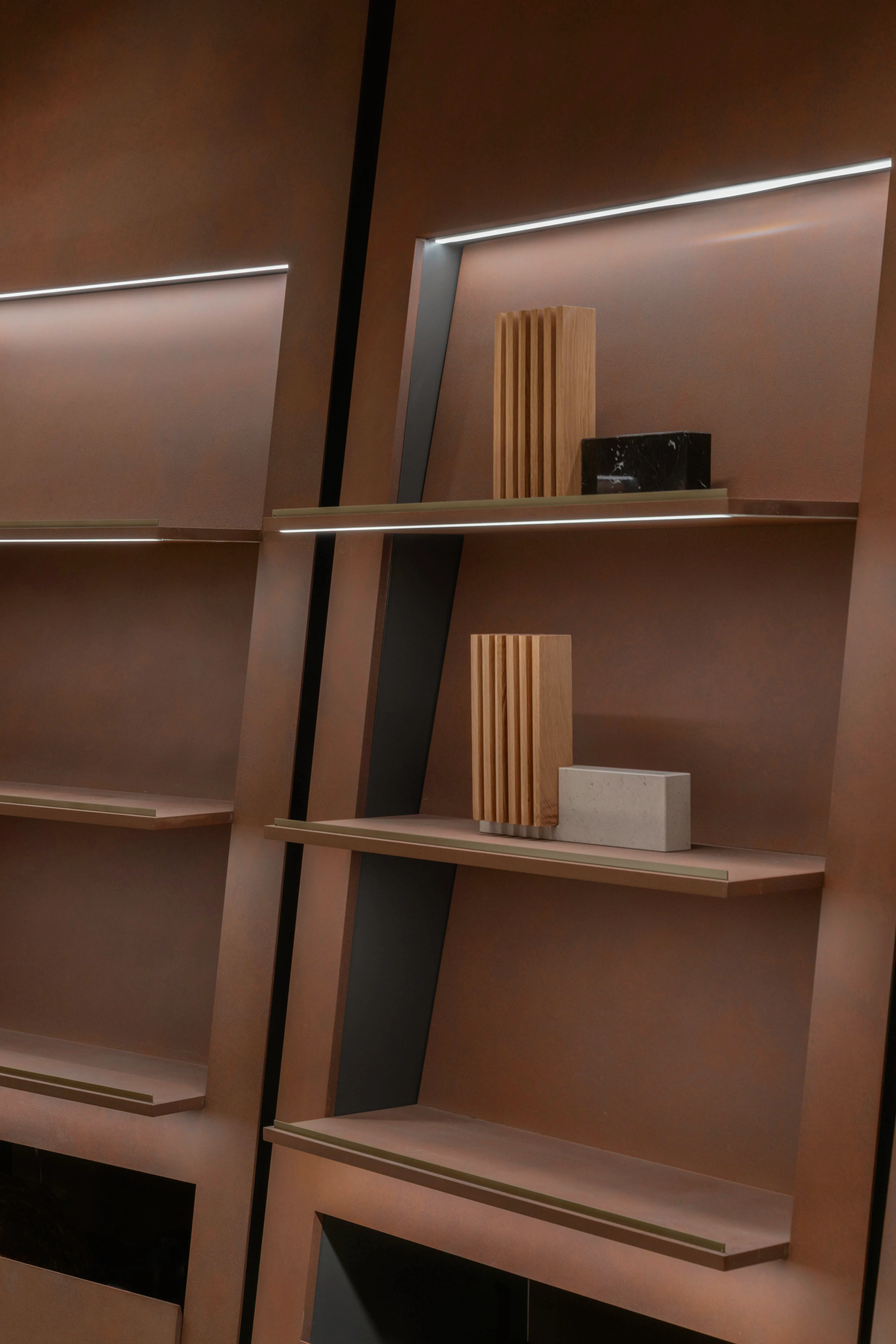 The experience is designed as a spiral formed by corten steel panels that draw visitors to the heart of the space, the meeting area. Along the way, three capsules create signature moments for exhibiting Arcos products through distinct material worlds.